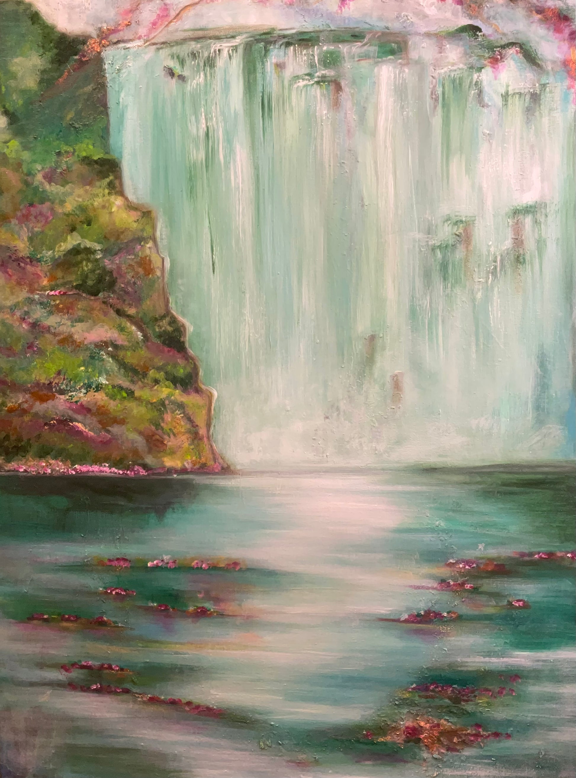 Vandfaldet falder som en blid, men vedvarende renselse – et symbol på naturens evne til at opløse det tunge og give plads til nyt liv. Farverne i turkis, grøn og rosa skaber en følelse af friskhed, håb og indre bevægelse.