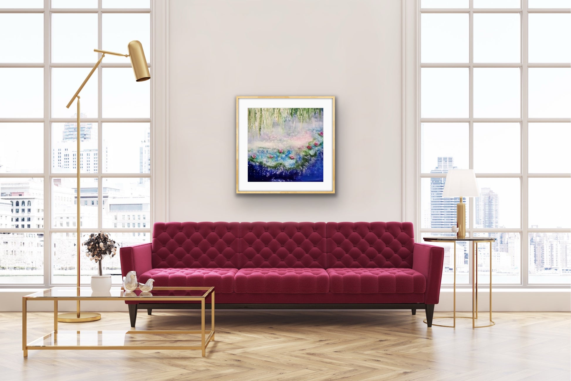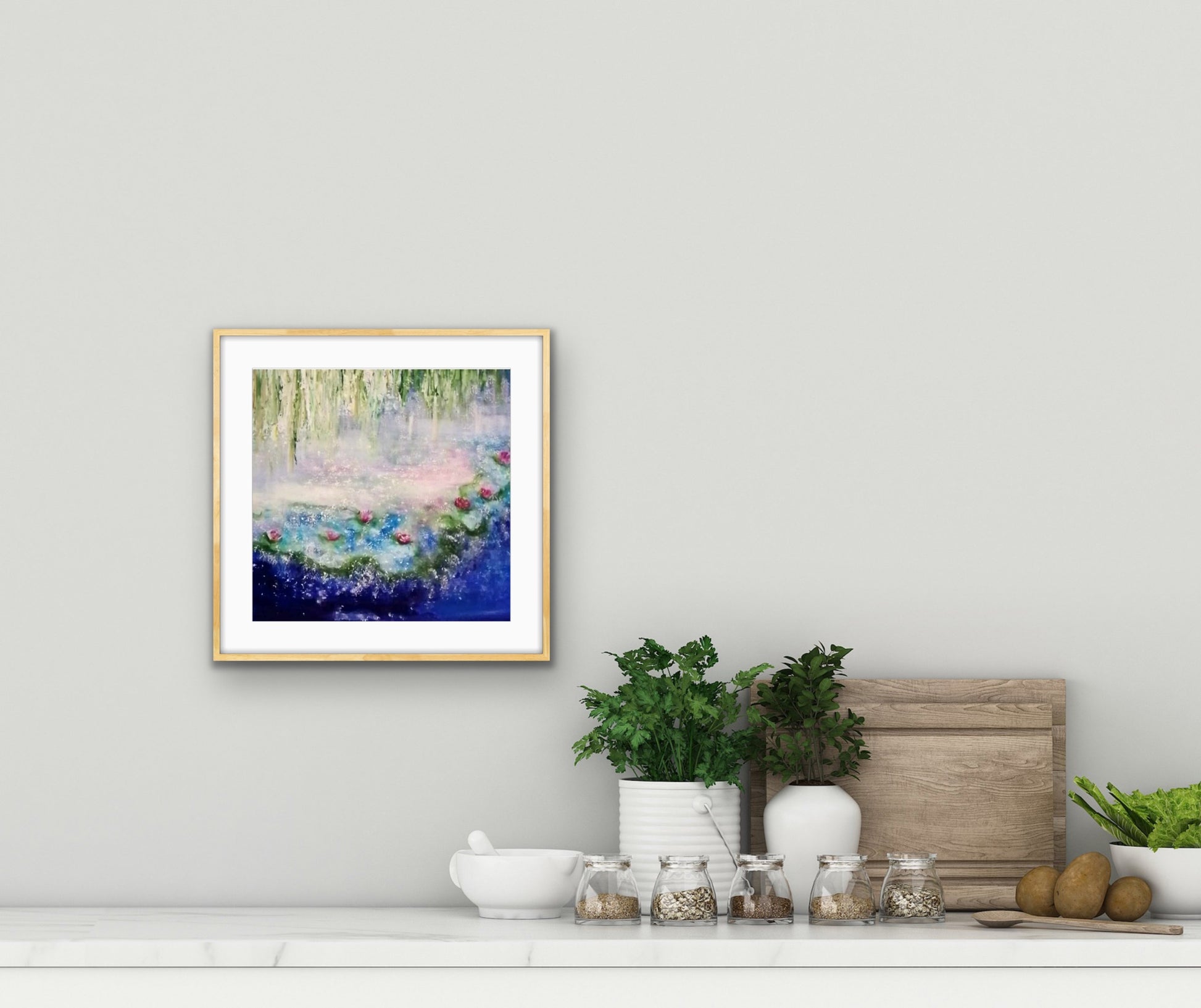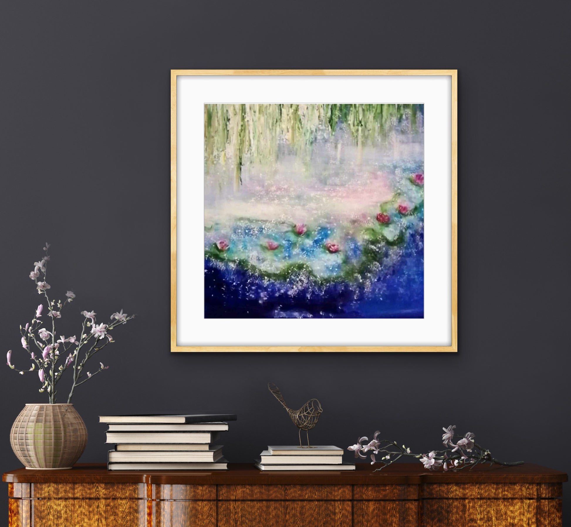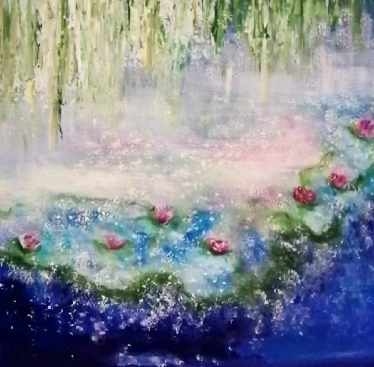 Soft greens and golds descend like whispers of willows, while rosecolored blossoms drift on the surface of deep blue water. The colors blend into one another as if moved by breath itself , creating a gentle vibration of peace and tenderness.